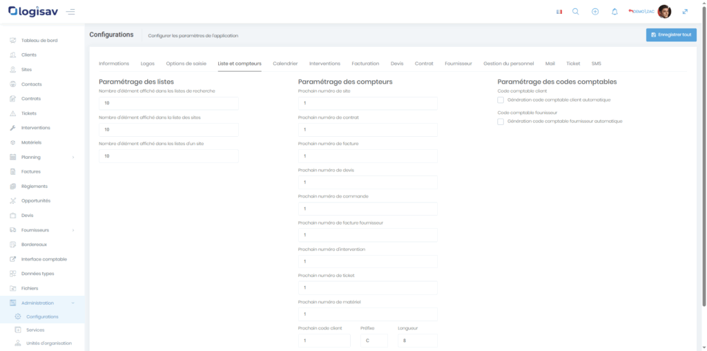 Le paramétrage des compteurs permet de définir le prochain numéro de création des éléments suivants :