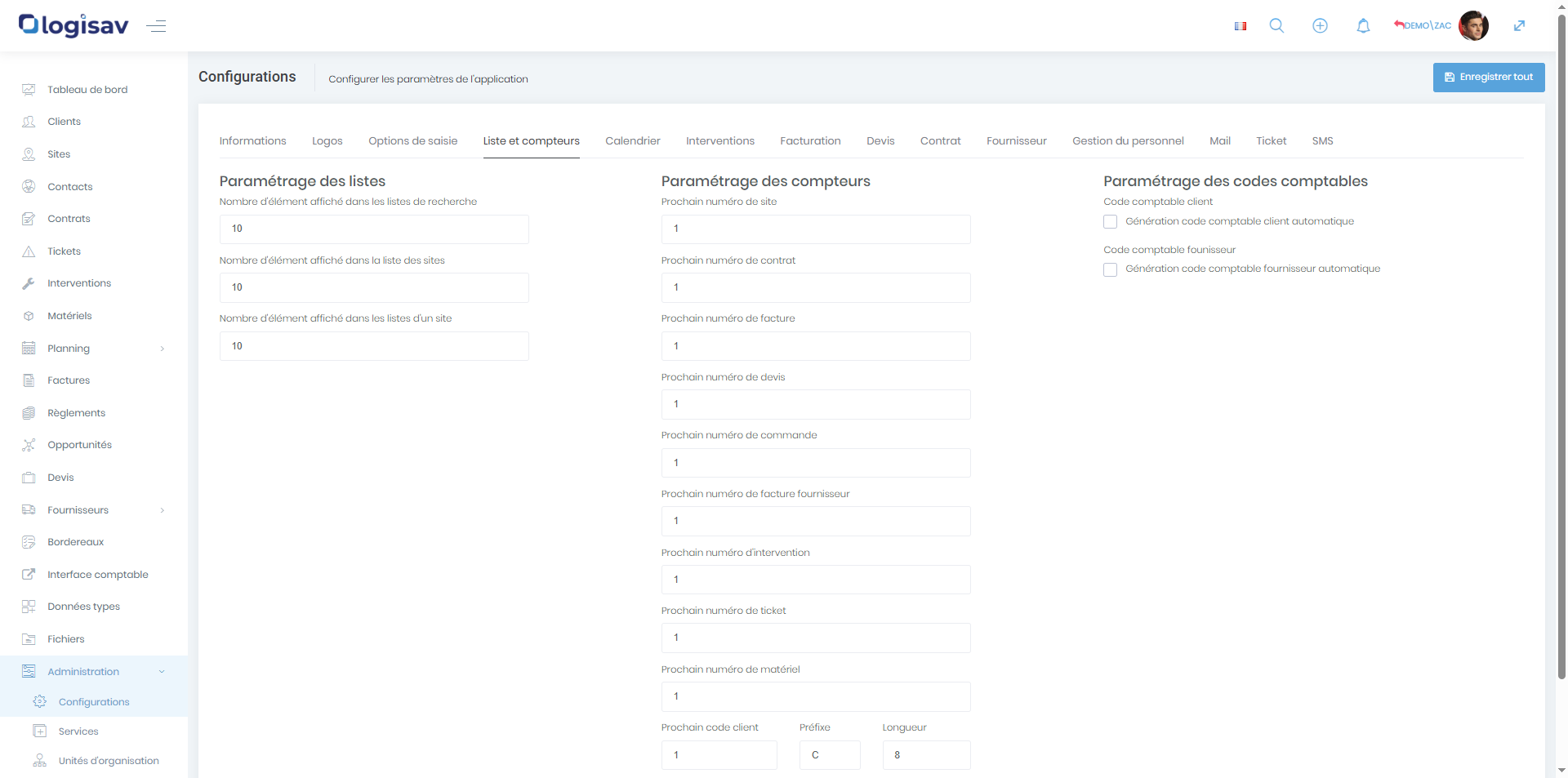 Pour accéder au menu de configurations de Logisav, cliquez sur le menu « Administration » puis sur « Configurations ».