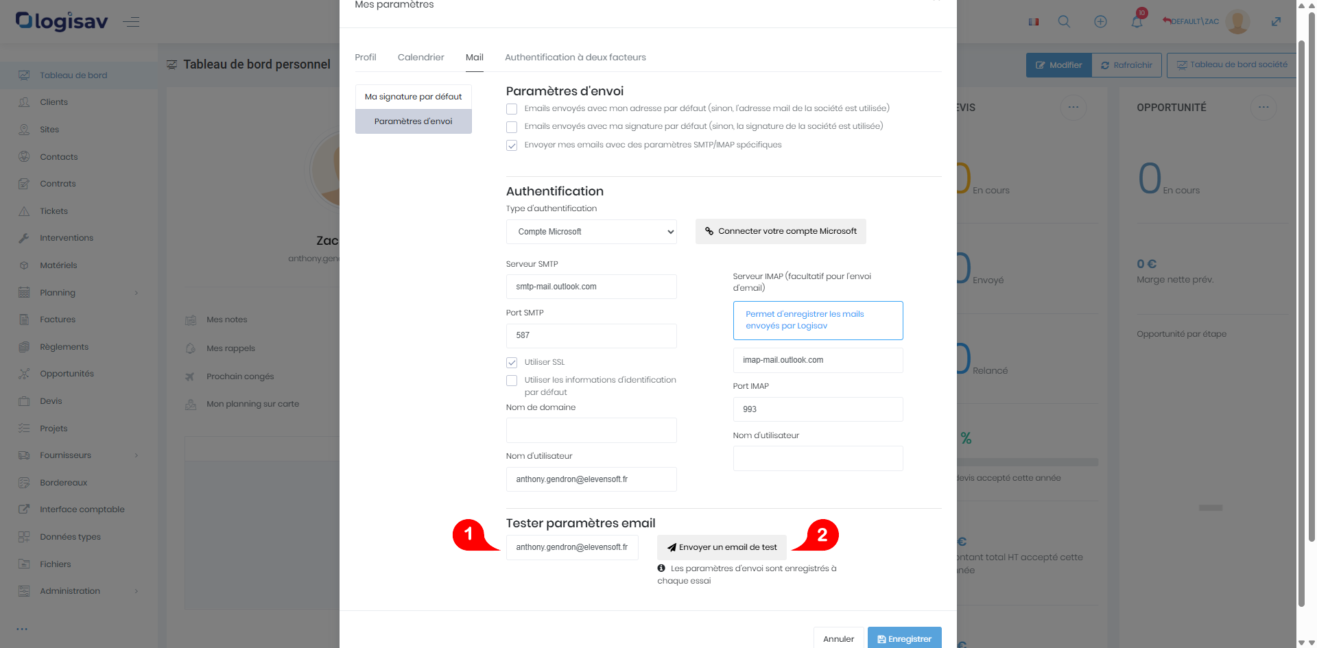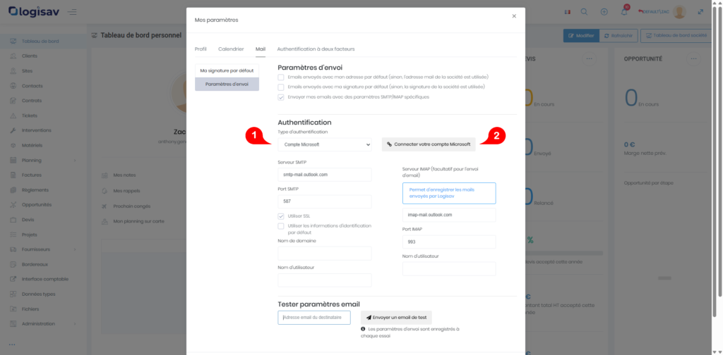 Logisav permet, depuis les paramètres utilisateurs – section Mail, de se connecter à un compte Microsoft afin de configurer les paramètres d’envoi des emails.