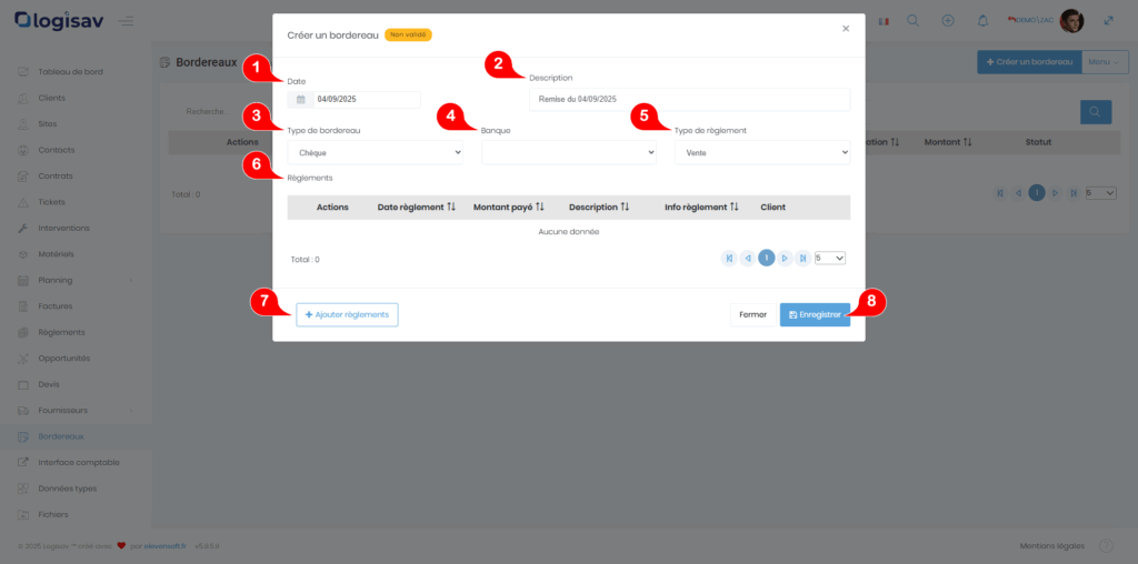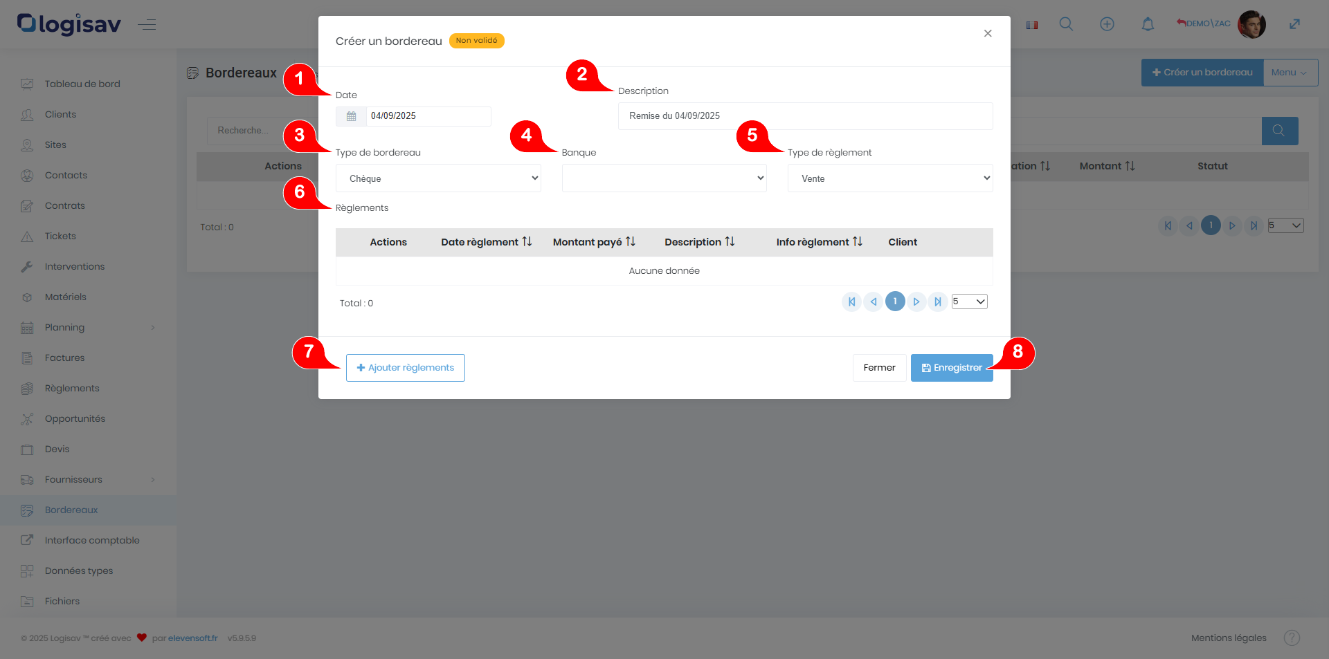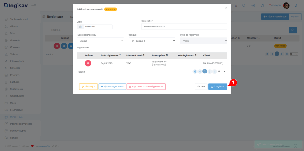 - Enregistrer : Bouton pour valider et sauvegarder le bordereau.
