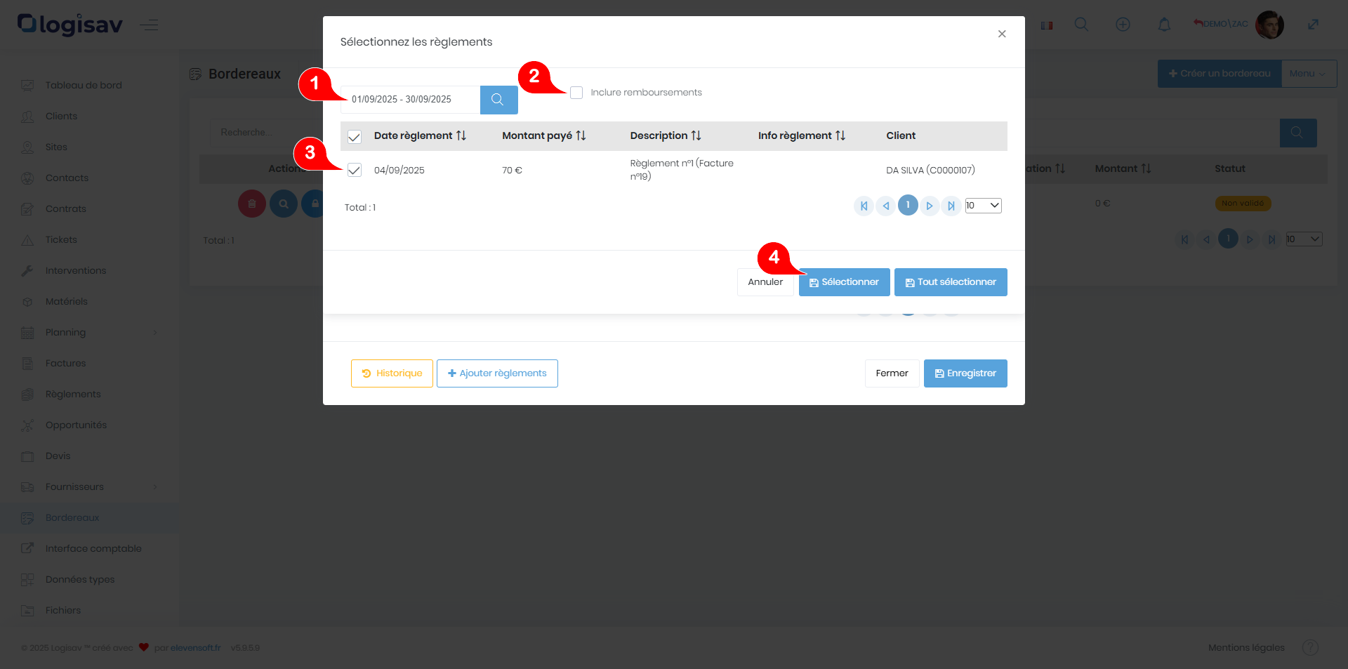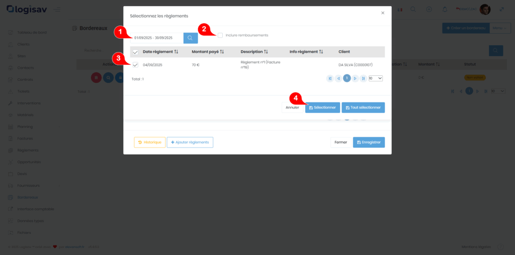 Vous pouvez affiner votre recherche en filtrant par période et décider d’inclure ou non les remboursements. Après avoir sélectionné les règlements souhaités, cliquez sur le bouton « Sélectionner » pour les ajouter au bordereau.
