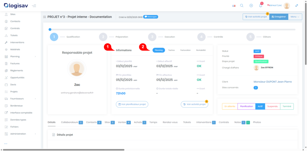 - Onglet « Interventions » : Liste les interventions liées au projet.