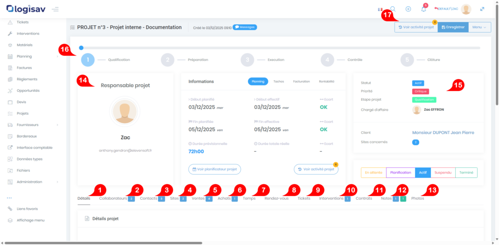 - Chargé d’affaire du projet, il s’agit en général de la personne ayant fait le suivi commercial avant la mise en projet (configuration possible depuis le menu « collaborateurs »).