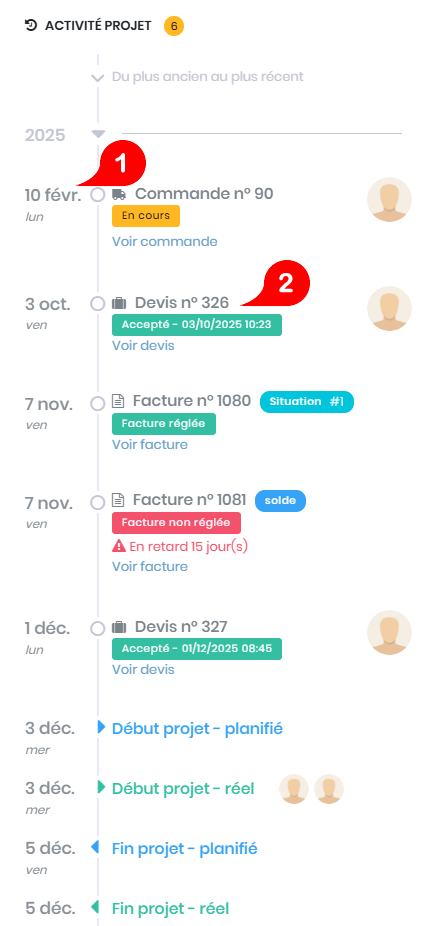 - Onglet « Ventes » : Liste les devis, opportunités et factures liées au projet.