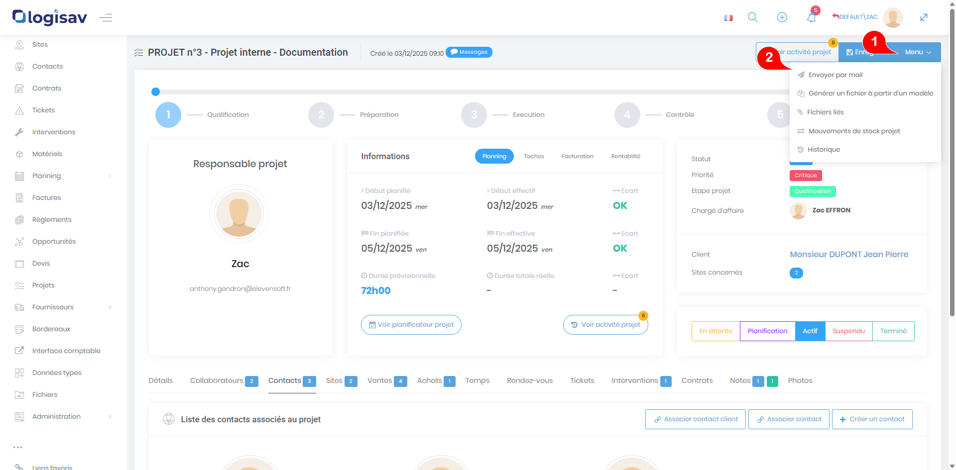 - Onglet « Contact » : Liste des contacts affectés au projet.