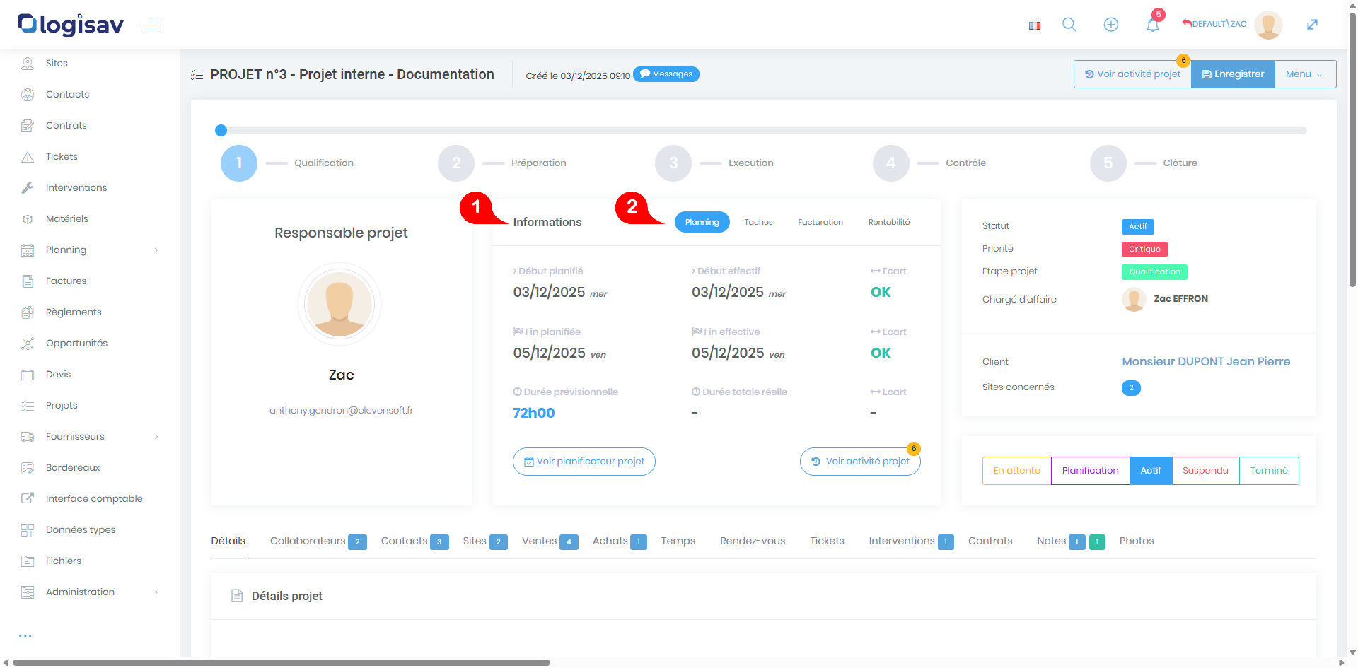 - Chargé d’affaire du projet, il s’agit en général de la personne ayant fait le suivi commercial avant la mise en projet (configuration possible depuis le menu « collaborateurs »).