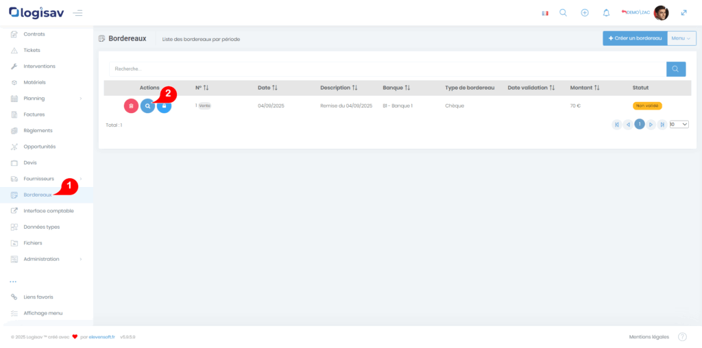 - Statut « non validé » : statut affecté à la création d’un bordereau.