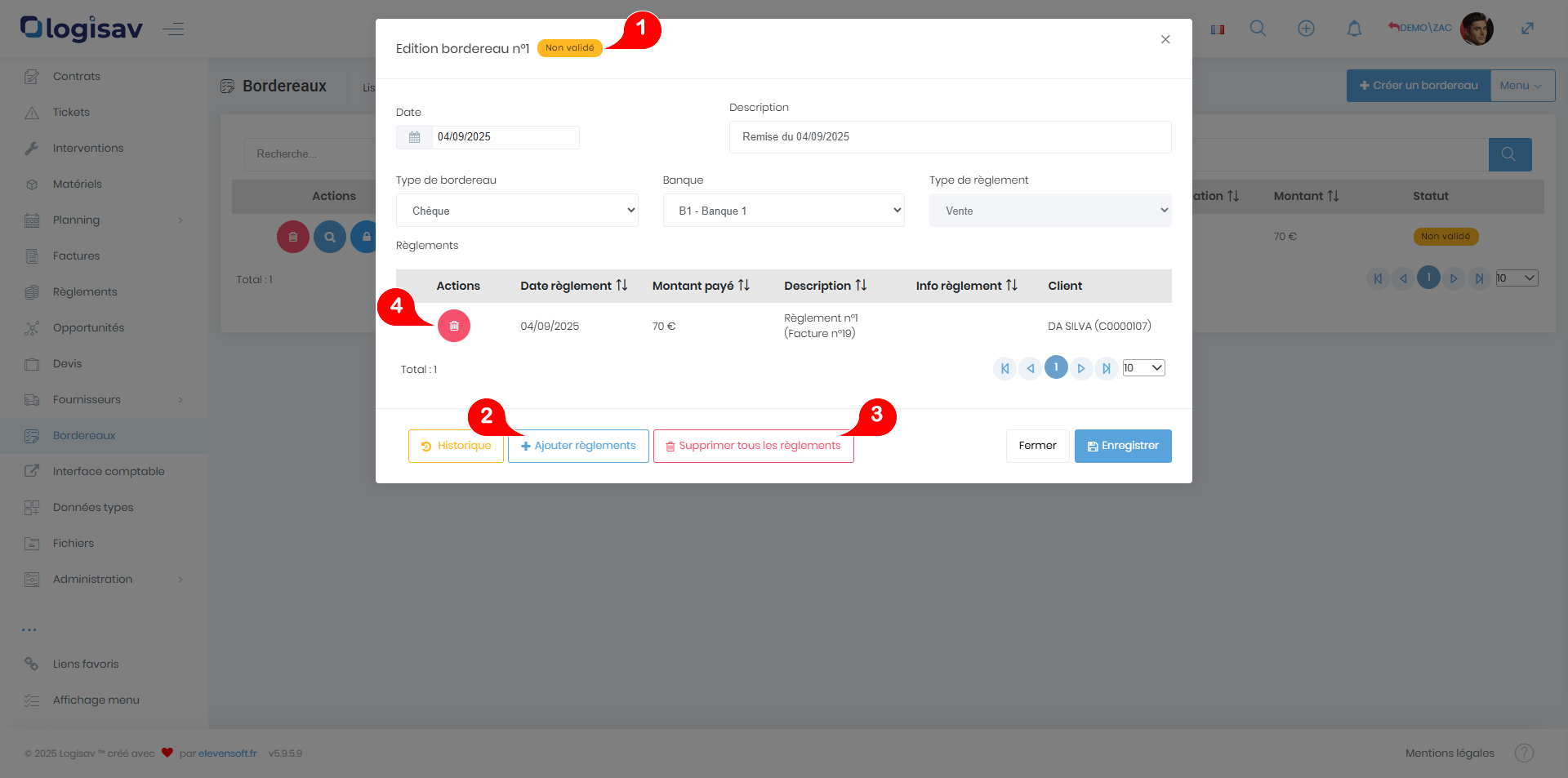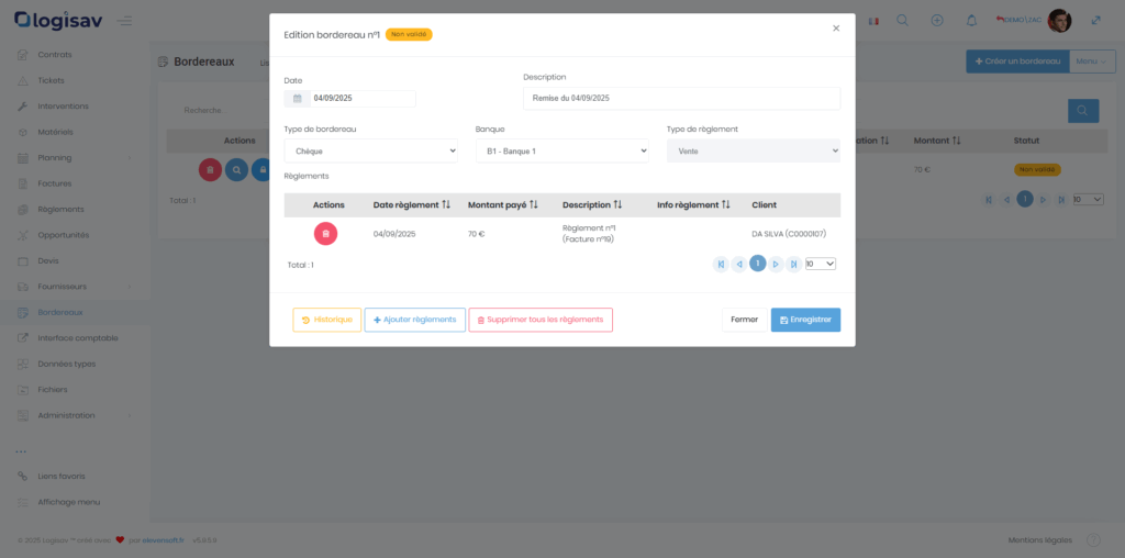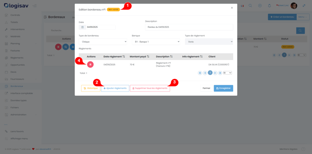 Lorsqu’un bordereau est en statut « non validé », l’utilisateur a la possibilité d’ajouter ou de supprimer des règlements. Pour cela, utilisez les boutons « Ajouter règlements » ou « Supprimer tous les règlements ». Vous pouvez également supprimer les règlements un par un en appuyant sur les boutons « corbeille » à gauche de chaque élément affiché :