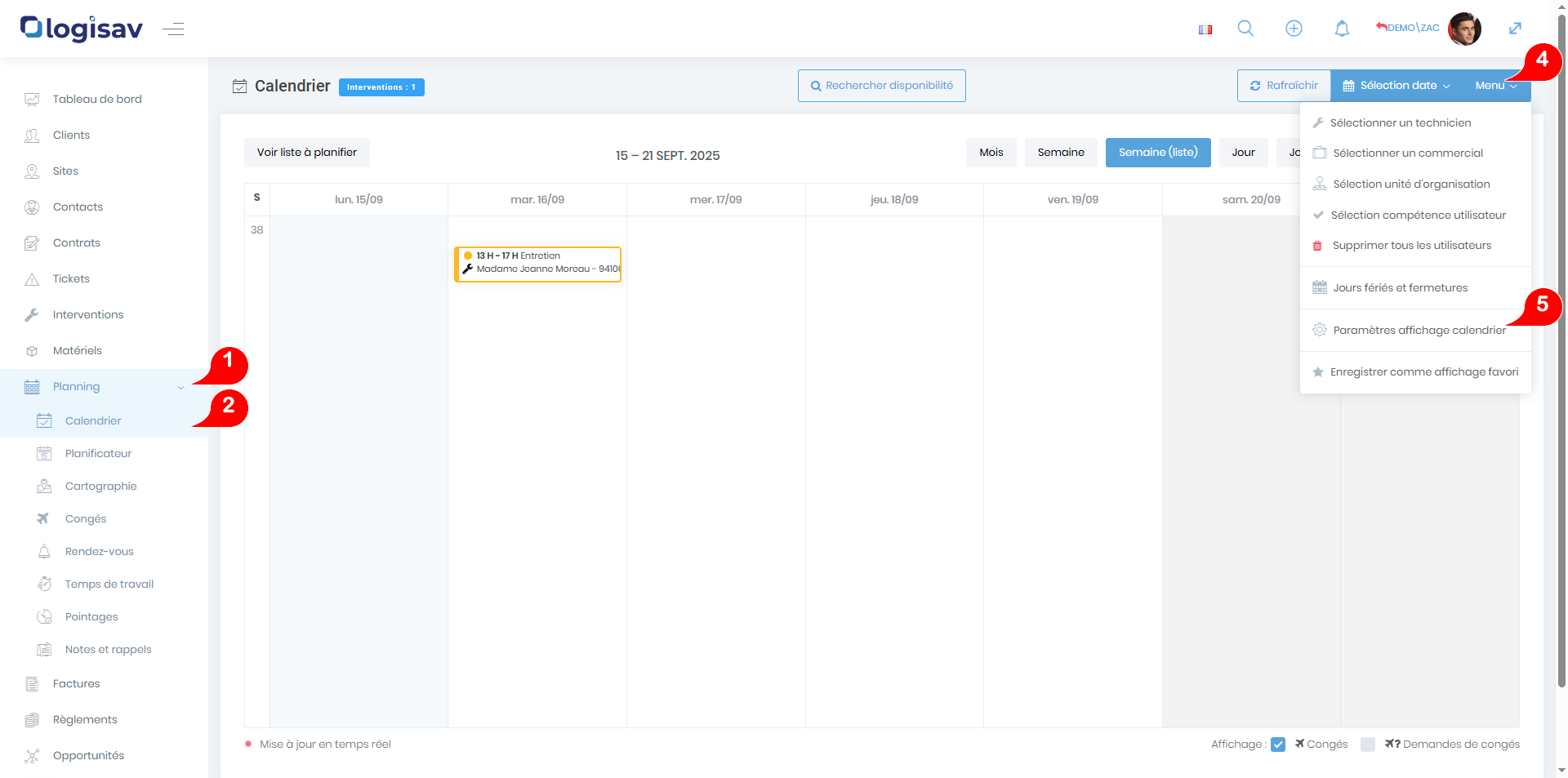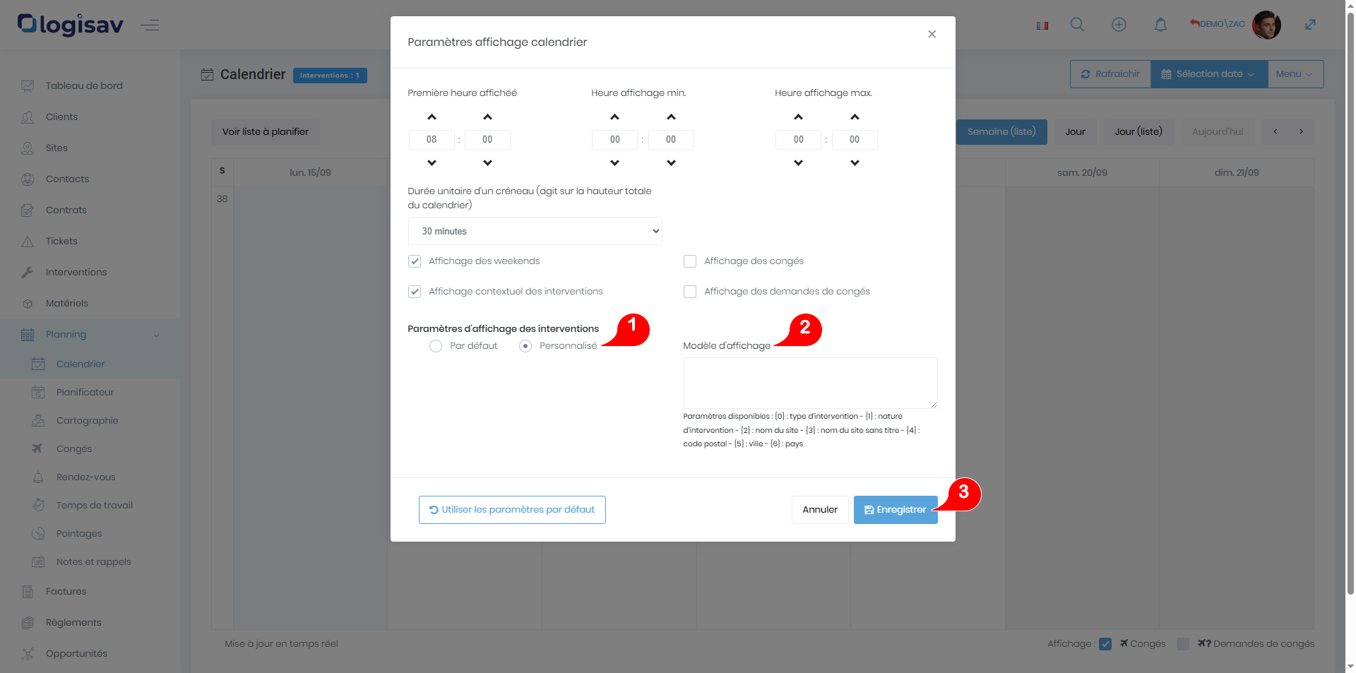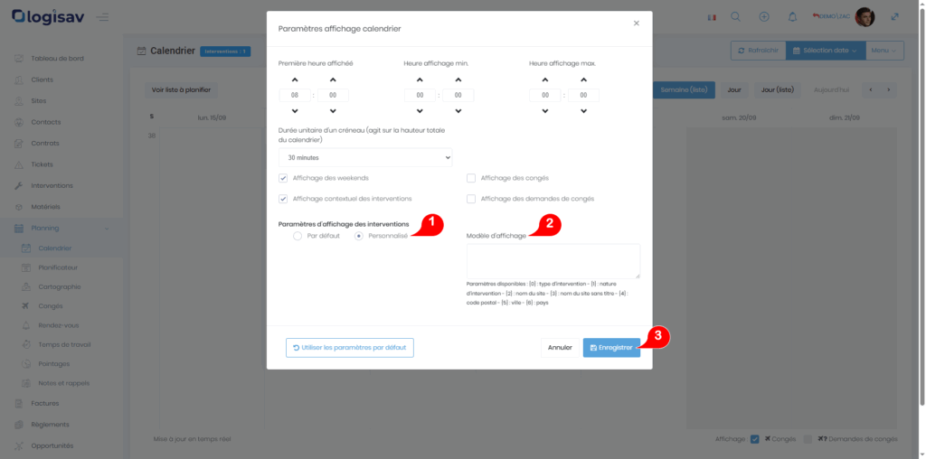 Dans Logisav, l’affichage des interventions dans le calendrier peut être configuré à l’aide de paramètres permettant d’adapter le texte affiché.