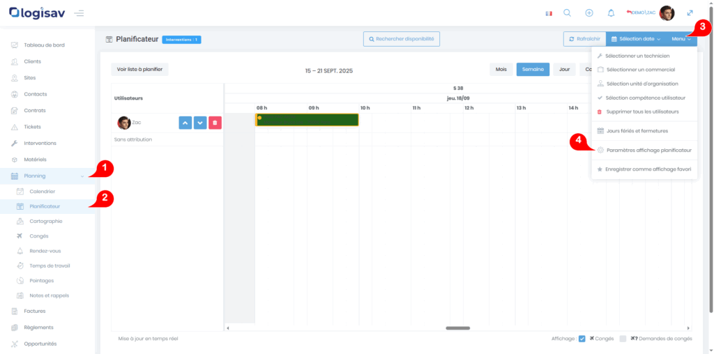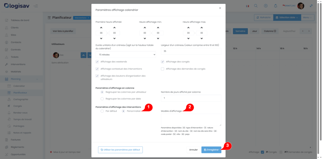 Vous avez la possibilité de personnaliser l’affichage des interventions dans le planificateur à l’aide de paramètres.