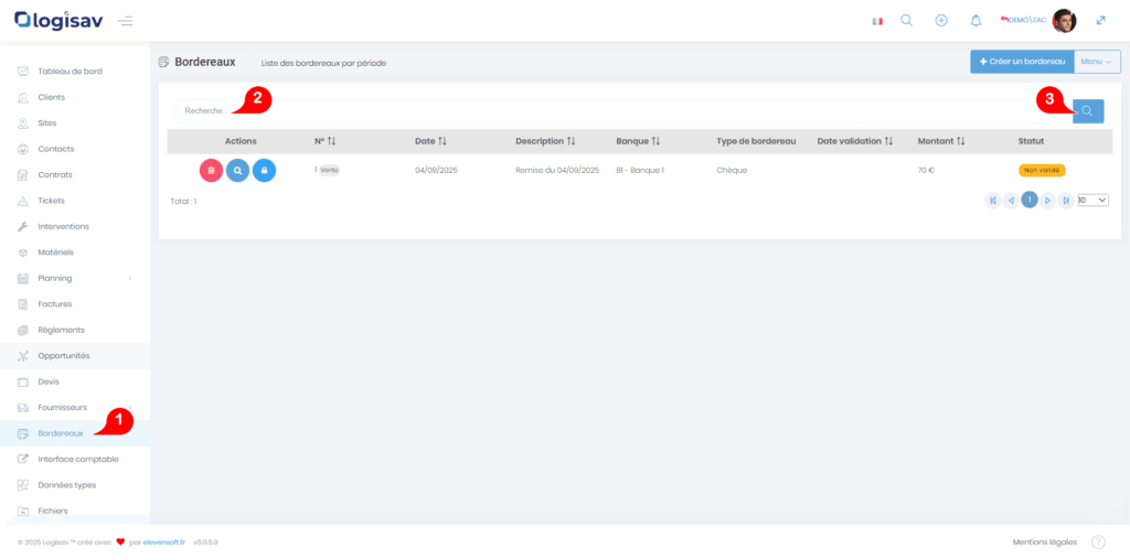 La liste de tous les bordereaux est accessible à partir du menu « Bordereaux ». Vous pouvez filtrer la liste affichée par la description du bordereau. Appuyez sur le bouton « loupe » pour mettre à jour la liste.