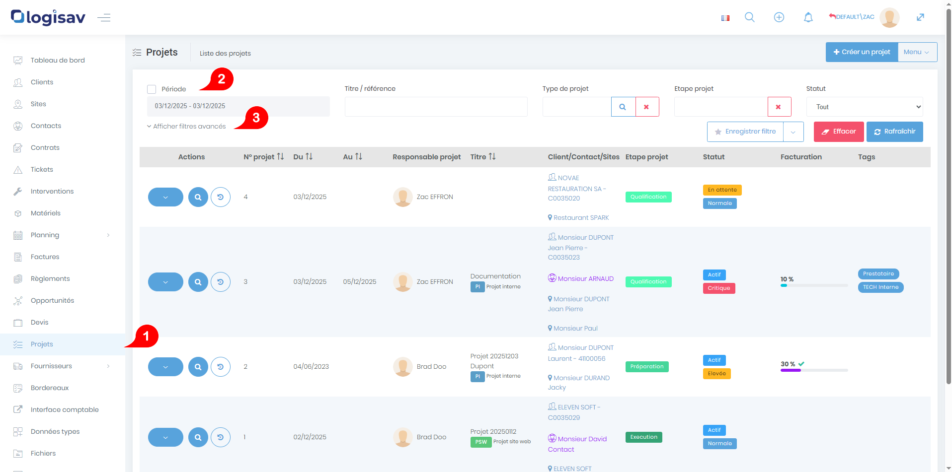 La liste des projets est accessible depuis le menu « Projets ».