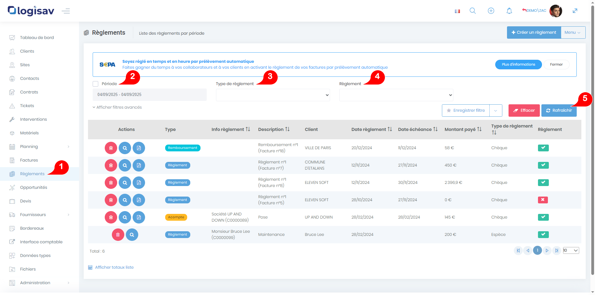 La liste de tous les règlements est accessible à partir du menu « Règlements ». Vous pouvez filtrer la liste affichée par période, par type de règlement et par statut (règlement efféctué ou non). Appuyez sur le bouton « Rafraîchir » pour mettre à jour la liste.