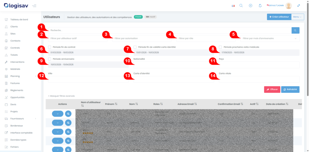 La liste de tous les utilisateurs est accessible depuis le menu « Administration » > « Utilisateurs ». Vous pouvez rechercher un utilisateur par son nom d’utilisateur, son nom, son prénom ou son adresse mail en saisissant quelques lettres puis en appuyant sur la touche « Entrée » de votre clavier (ou sur le bouton « Loupe » à droite de la zone de recherche).