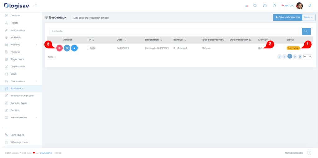 - Le bordereau doit être en statut « non validé »