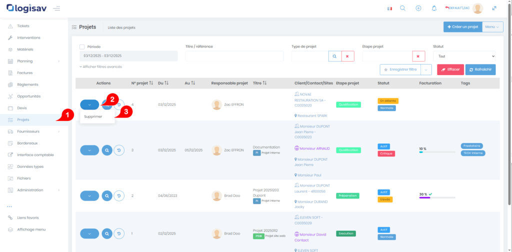 Supprimer un projet Vous êtes ici : Documentations Projet Supprimer un projet Un projet peut être supprimé à partir de la liste des projets. Pour cela, ouvrez le menu contextuel du projet à supprimer et appuyez sur le bouton « Supprimer ». Ce bouton peut être absent si vous ne disposez pas des autorisations adéquates.